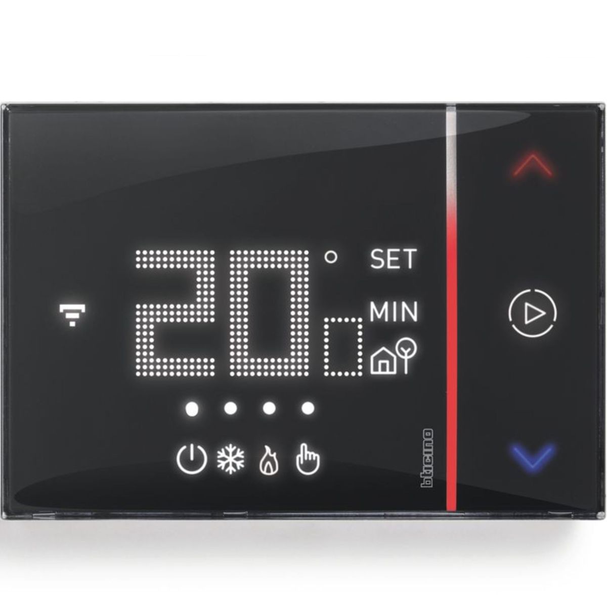Evoluzione dello Smarther, ecco il nuovo cronotermostato da incasso BTicino di colore nero che inabbinamento con la APP Home + Control permette di regolare e monitorare la temperatura all'interno degli ambienti in modo preciso e puntuale; tutta la programmazione e gran parte delle funzioni vengono effettuate in maniera semplice e intuitiva utilizzando la APP.