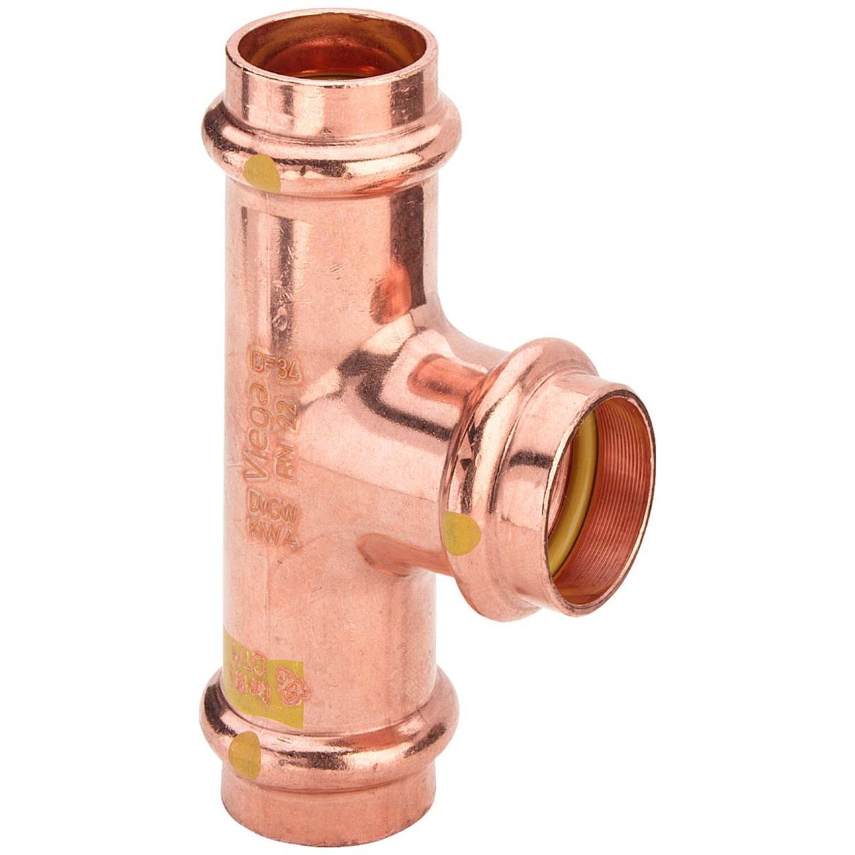 Raccordo a T del sistema Profipress G, sviluppato per garantire connessioni sicure e affidabili nelle installazioni di gas metano e GPL, realizzato in rame di alta qualità, il raccordo è dotato di tre connessioni a pressare e include un anello di tenuta in HNBR di colore giallo, che assicura una tenuta ermetica e duratura.