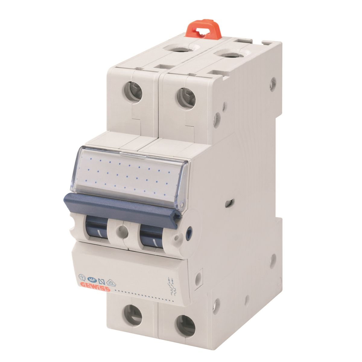 Compact 2P overload and short-circuit protection circuit breaker with 20A rated current and 10KA breaking capacity.