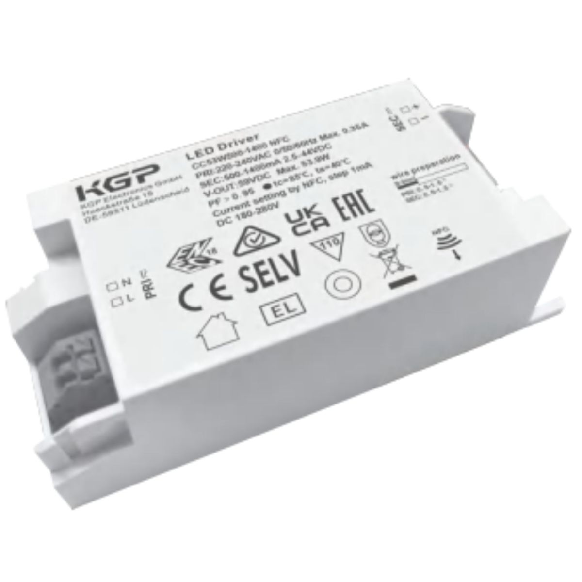 El 026.328 es un controlador LED de corriente constante con configuración NFC (ajustes en pasos de 1 mA) que admite salidas de 500 mA a 1400 mA, con una potencia máxima de 53,9 W.