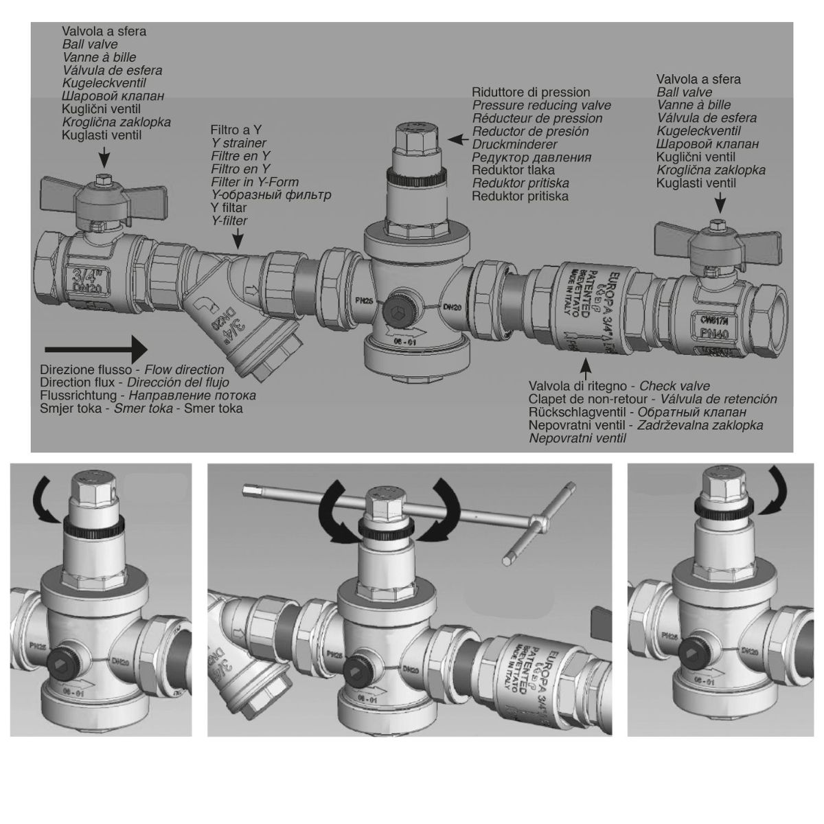 El reductor de presión mantiene constante la presión del agua de salida, independientemente de las variaciones en la presión de entrada o la cantidad de agua utilizada. El elemento central del sistema es una membrana que detecta la presión del agua de salida. Esta presión contrarresta la fuerza de un resorte, cuya tensión se ajusta mediante la perilla que establece el valor de presión deseado.