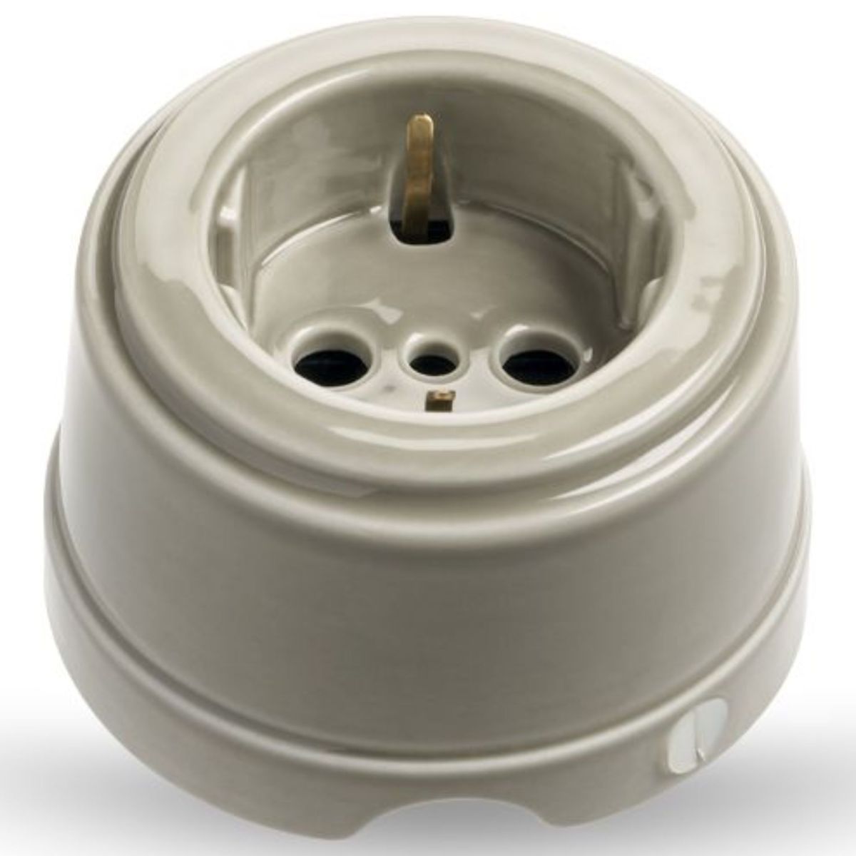 Representa la excelencia de la artesanía italiana aplicada a los componentes eléctricos para mobiliario; está fabricada en porcelana pura de color gris paloma con un acabado brillante.