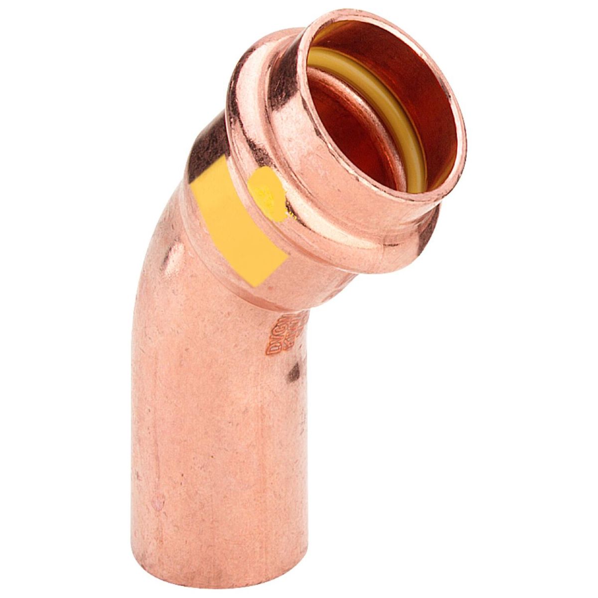 Fabricado en cobre de alta calidad, el accesorio tiene una curva de 45° y está equipado con tecnología SC-Contur, que permite la detección inmediata de cualquier fuga durante la prueba, aumentando la seguridad del sistema.