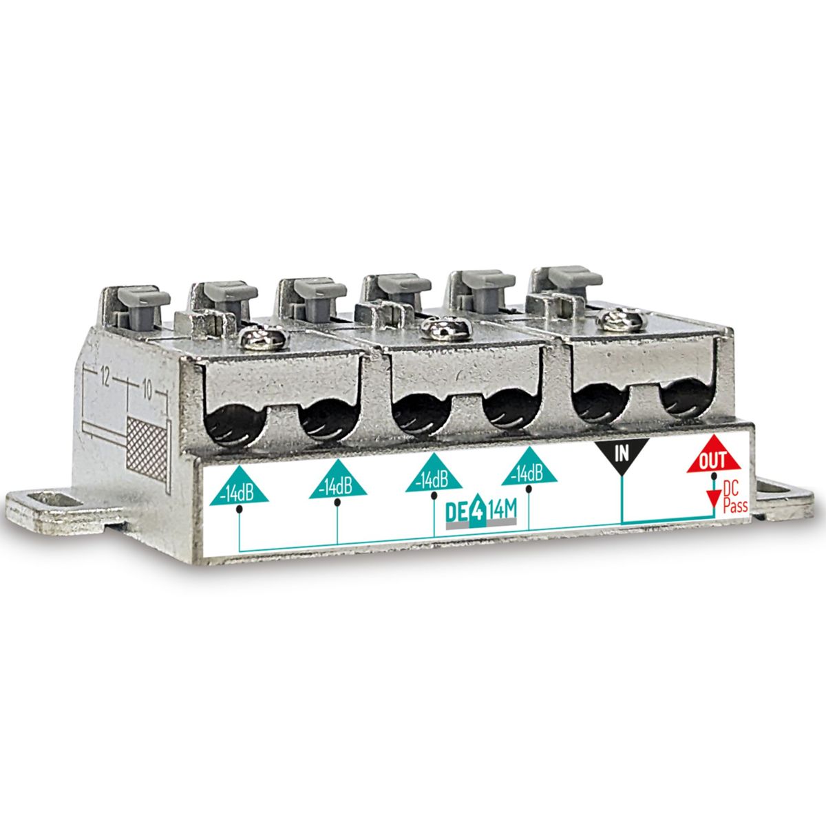 Il possède 1 entrée, 1 sortie directe et 4 sorties dérivées avec une atténuation de 14 dB, permettant une distribution correcte du signal le long de la ligne.