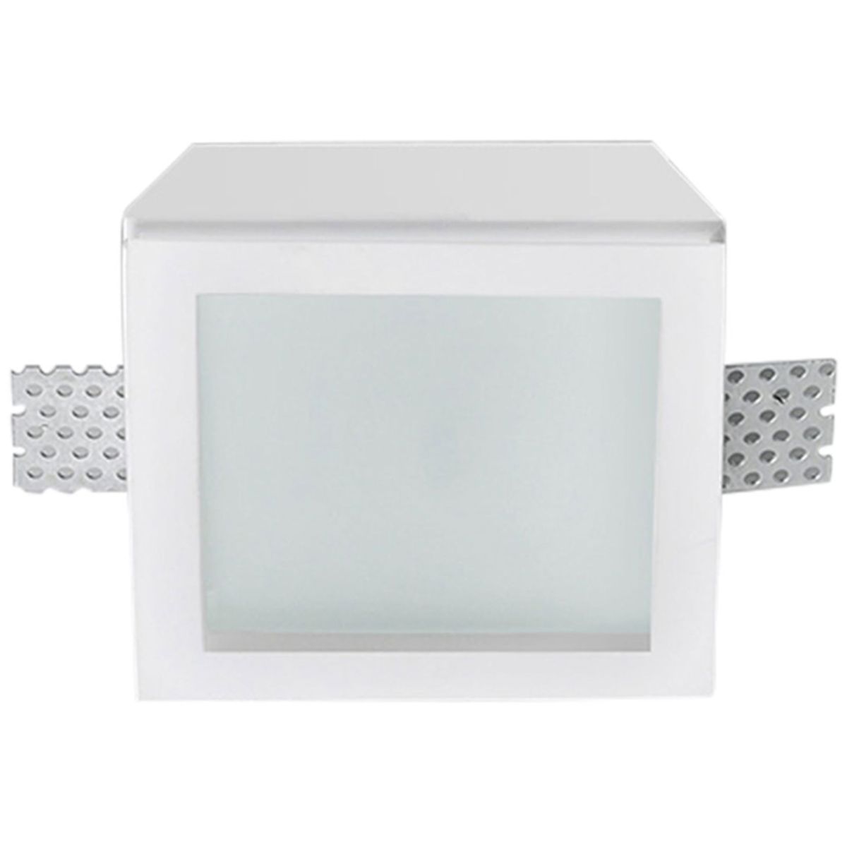 Le trou encastré requis mesure 102 × 102 mm, la structure comprend un ressort en acier inoxydable pour fixer la source lumineuse, un diffuseur en verre plat sablé et des supports de fixation en tôle micro-perforée.