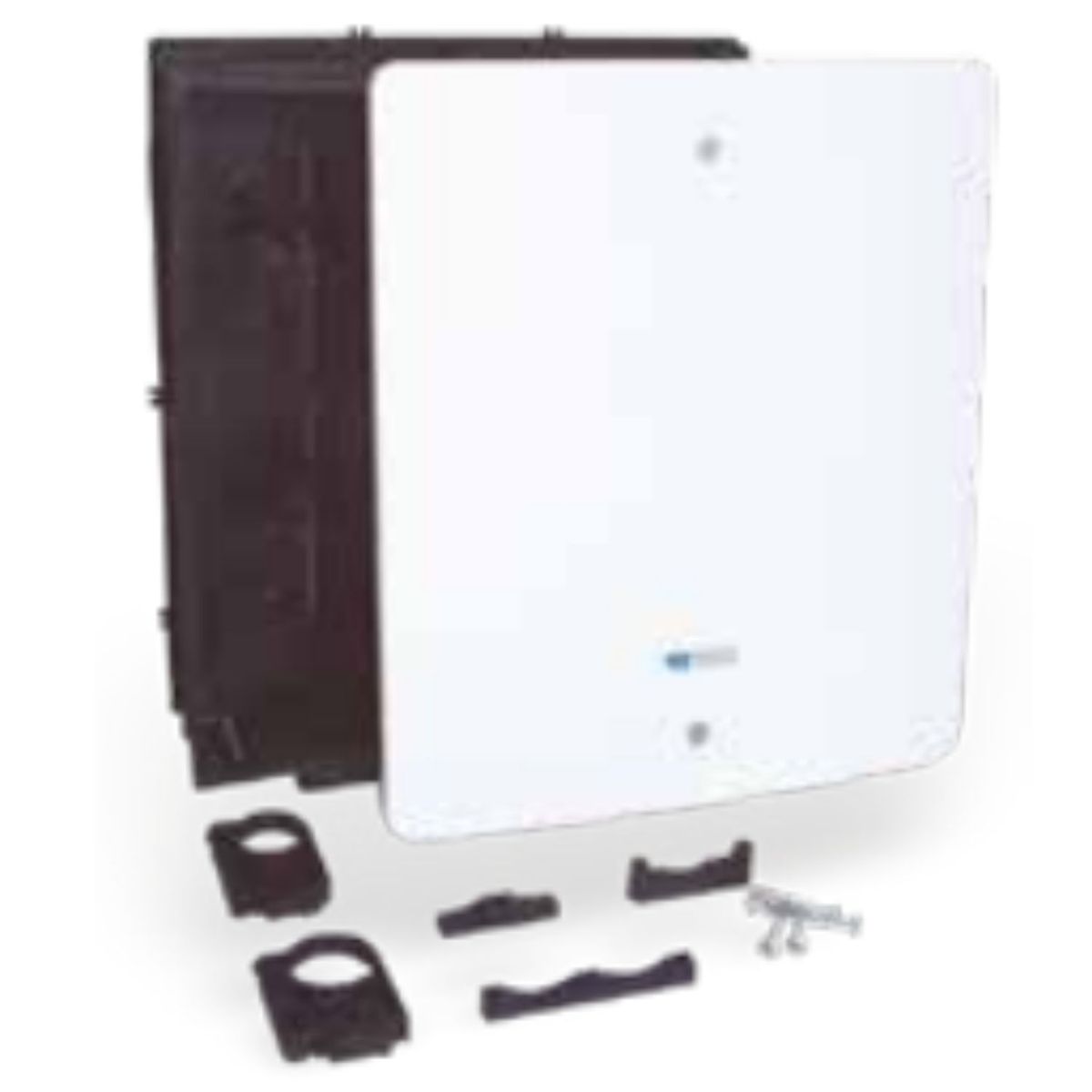 Coffret en plastique à encastrer complet de base, cadre avec ouvertures préformées, couvercle avec fermeture à vis, protection amovible pour travaux de maçonnerie et accessoires pour la fixation de collecteurs simples et de collecteurs coplanaires de 3/4” et 1”.